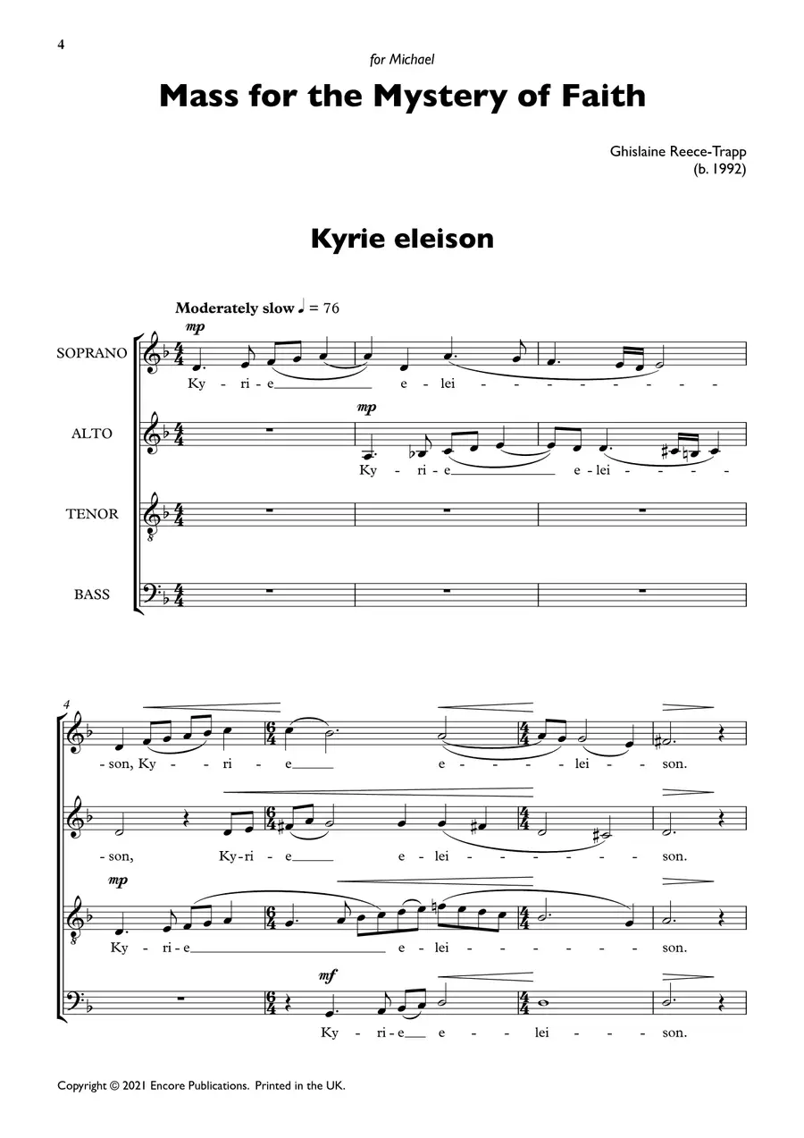 This mass setting by Ghislaine Reece-Trapp is a modern take on the polyphonic masses of Byrd and Palestrina. Expressive melodic ideas thread between the different voices and movements. The music also explores a range of moods from anguish and desolation to intimacy and joy, reflecting the richness and complexity of faith in the modern world.